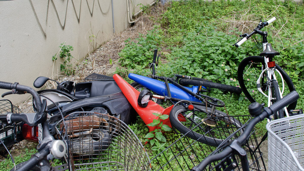 タバコの吸い殻、レシート、壊れたビニール傘、コーヒー缶、ビール缶、スプレー缶のフタ、ヘアーゴム、使ったティッシュ、コンビニの袋とその時食べたアイスの袋、何かビニールの切れ端、自転車、バイク、雨に濡れた段ボール、フリーペーパー、ペットボトルのキャップ、不織布マスク、吸い殻を集めた袋、カバンの切れ端、菓子の包装など。